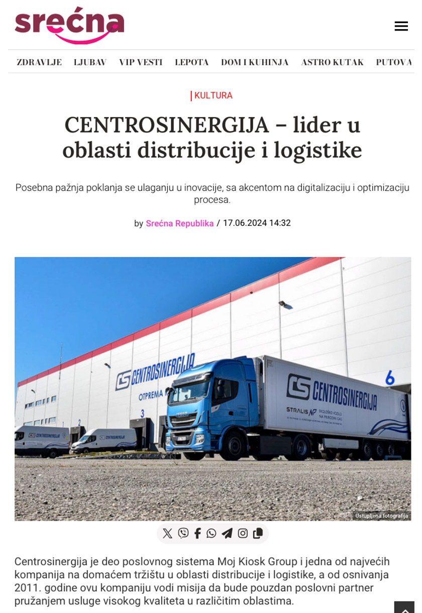 Centrosinergija je deo poslovnog sistema Moj Kiosk Group i jedna od najvećih kompanija na domaćem tržištu u oblasti distribucije i logistike. Od osnivanja 2011. godine Centrosinergiju vodi misija da bude pouzdan poslovni partner pružanjem usluge visokog kvaliteta u različitim oblastima…