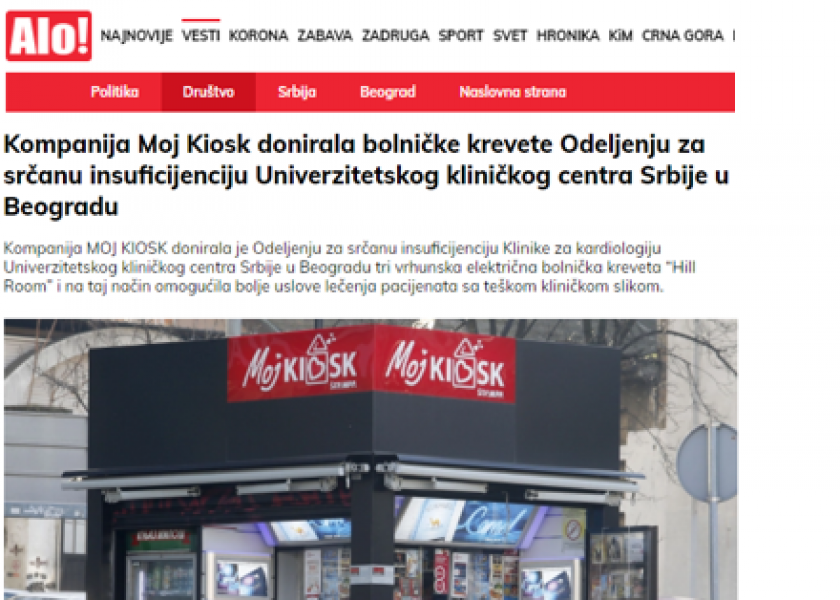 Belgrade, May 27, 2021 - The company MOJ KIOSK donated three top electric hospital beds "Hill Room" to the Department of Heart Failure of the Cardiology Clinic at the University Clinical Center of Serbia in Belgrade, thus providing better treatment conditions for patients with the severe clinical picture.