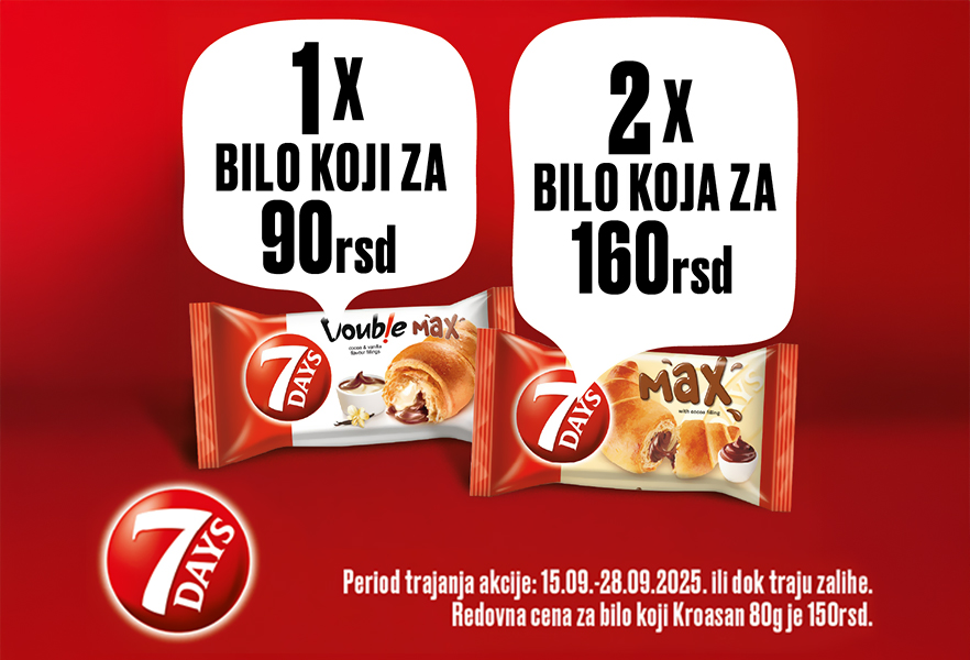 Experience the pleasure of the creamy taste of chocolate and vanilla and the foamy dough of 7DAYS croissants. Now on sale at a special price.