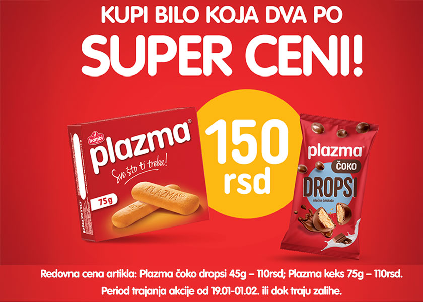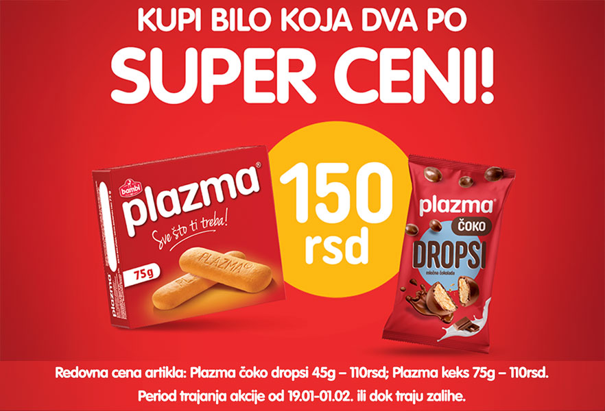 For a quick snack, extra energy, and a daily dose of optimism, try Plazma Biscuits and Plasma Choco Drops. Look for a special offer at the Moj kiosk objects: buy any two for 150 dinars.
