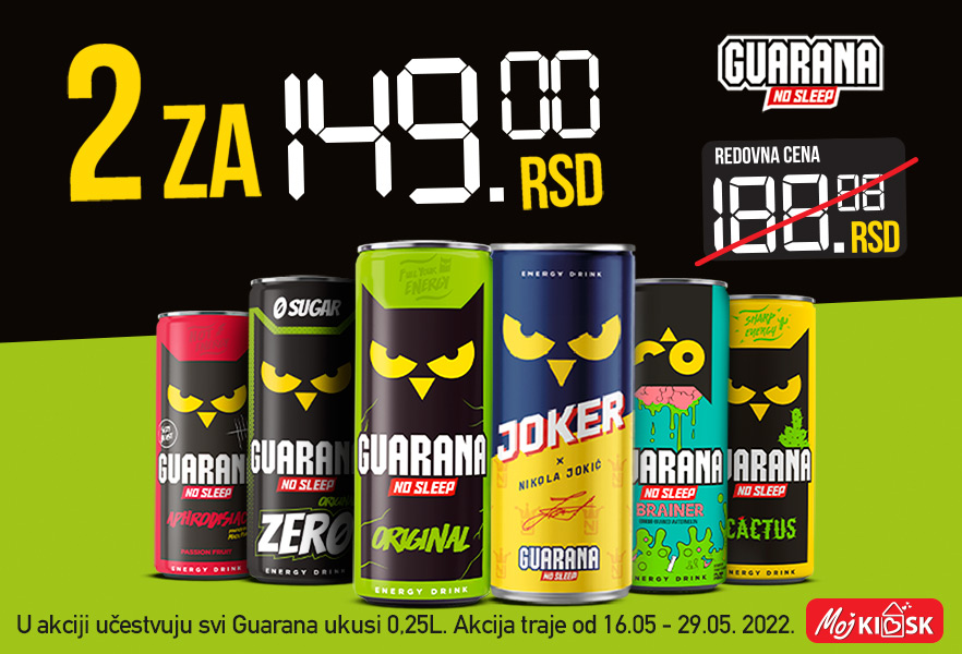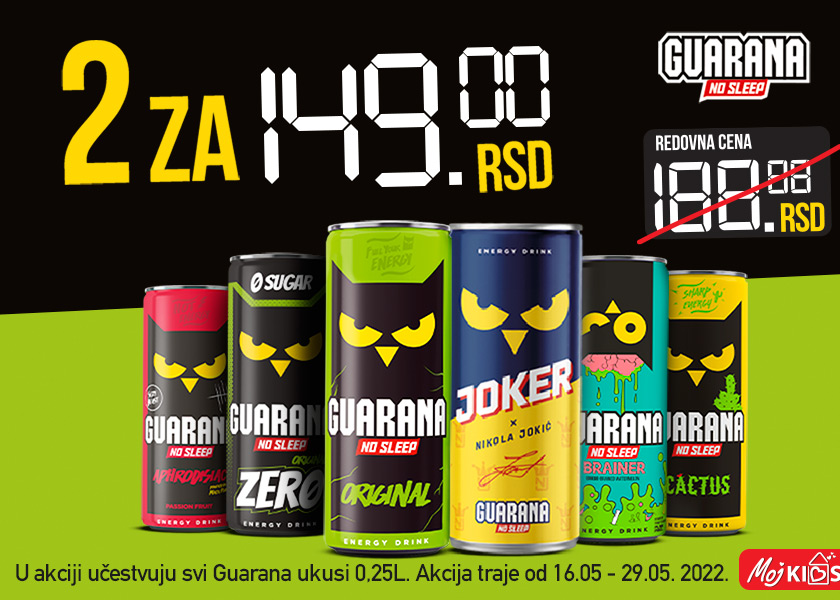 Did you know that Guarana is the best-selling and most popular energy drink in Serbia and the region? The MojKiosk offers Original Green Guarana, Guarana Cactus, Guarana Brainer, Guarana Zero, and Guarana Joker. Choose your favorite flavors and give yourself energy for the whole day!